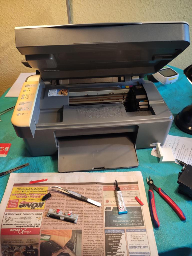 In einem Drucker ist ein Plastikteil mit den Jahren spröde geworden und gebrochen. Um das Teil zu stabilisieren hat der Besucher eine alte EC-Karte zur Verfügung gestellt, mit der unser Reparaturhelfer Davide das Teil retten konnte.