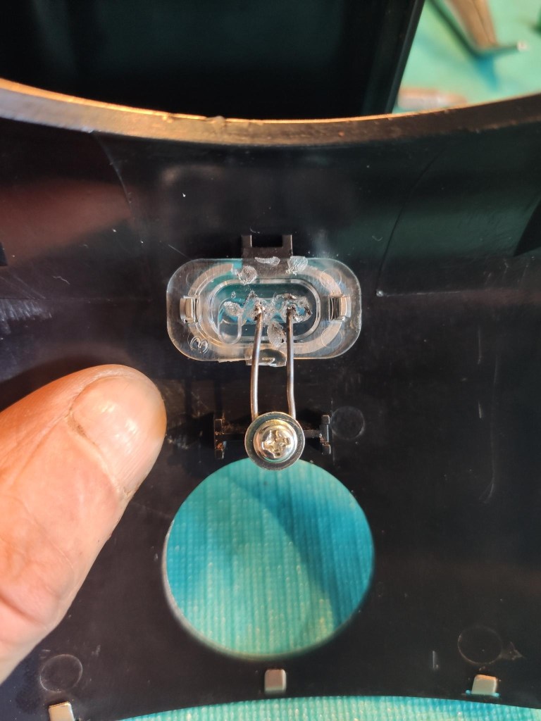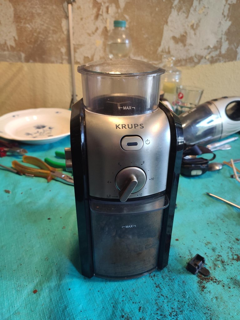 In diesem Fall ging es um eine elektrische Kaffeemühle, bei der der Schalter innen abgebrochen war, wodurch das Gerät nicht mehr eingeschaltet werden konnte. Da die Federung für den Schalter aus Plastik war, ließ sich das Ganze auch nicht mehr kleben. Unser Helfer Dirk hat eine Federung aus einem Stück Draht gebogen und damit die gesamte Maschine gerettet.